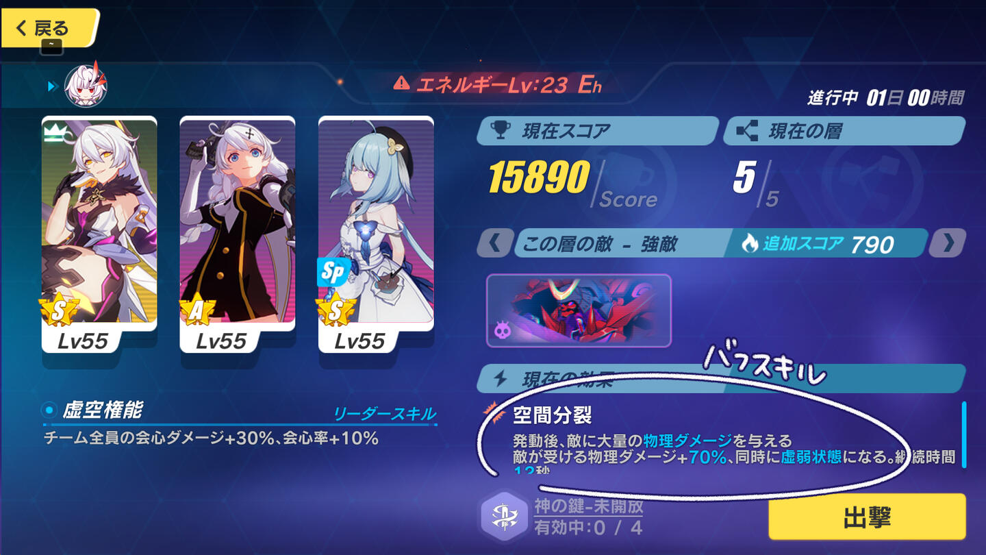ただ、層ごとに戦闘不能になったキャラも含め体力を回復してくれるので全滅さえしなければなんとかなる!後半の5回戦では定期的に発生する量子波動の赤い輪がぴったり重なるタイミングで回避したり、敵の攻撃を極限回避をするとゲージが溜まってバフスキルが使用できるようになります