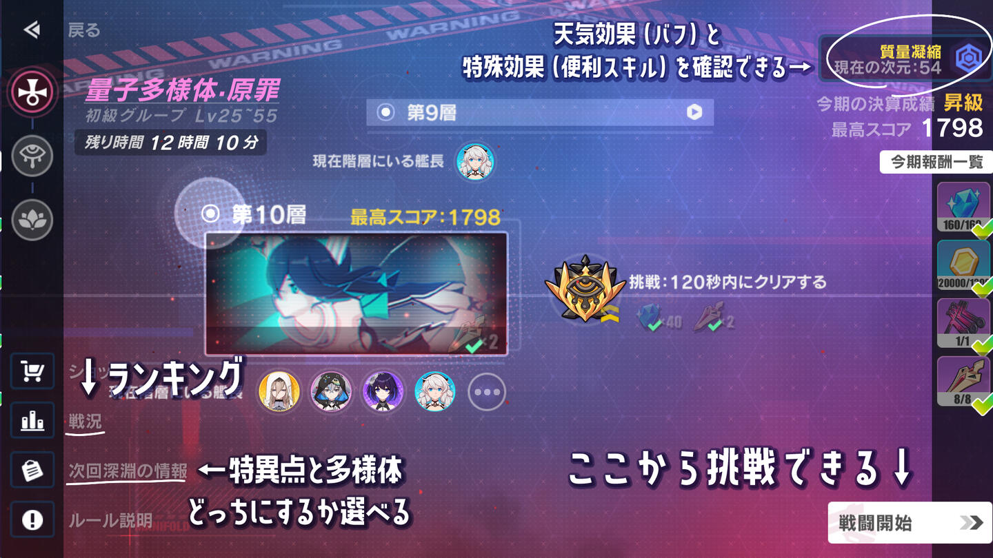 天気効果が物理バフか元素バフかによって編成を変えましょう特異点とは違い、層ごとに回復してくれないのでできるだけ被弾しないようにしましょう