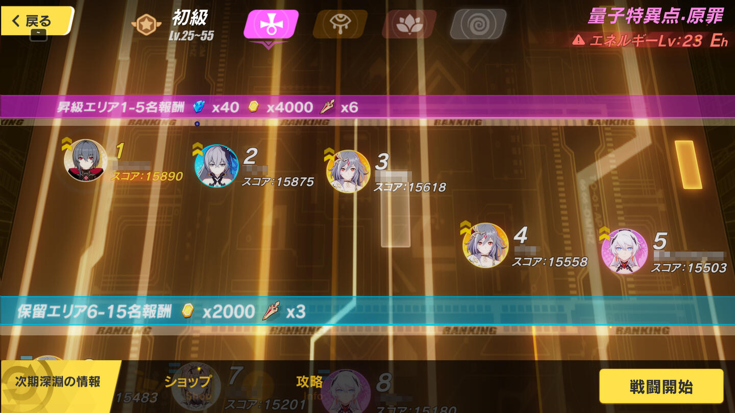 月曜と木曜の週2回更新される低い方から原罪・苦痛・紅蓮の3段階にランクが分かれていて、高くなればなるほど敵が強くなるのですが、その分報酬も増えます物理攻撃が有利な日と元素攻撃が有利な日があるので、物理編成と元素編成の2種類あるとランク維持がしやすいです